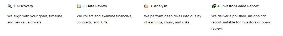 A snapshot of our core diligence capabilities for investors and CFOs.